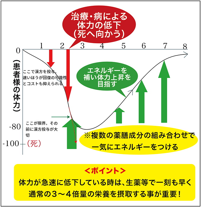 図のようにターニングポイント(しきい値)を上げることで、漢方の効果が最大限に生かせるように組み合わせを考えていきます。