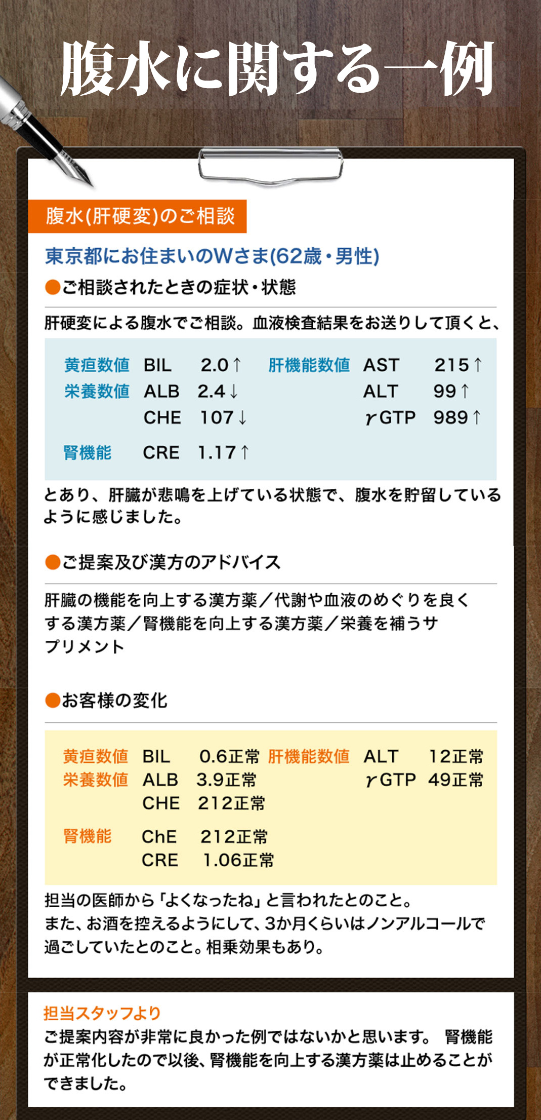 アルブミンを増やし、腹水が減ると圧迫感も徐々に無くなり便秘も解消に向かいますが、患者様によっては腸の働きが弱っている方もおられるので「漢方」の働きで便の排出を促します。