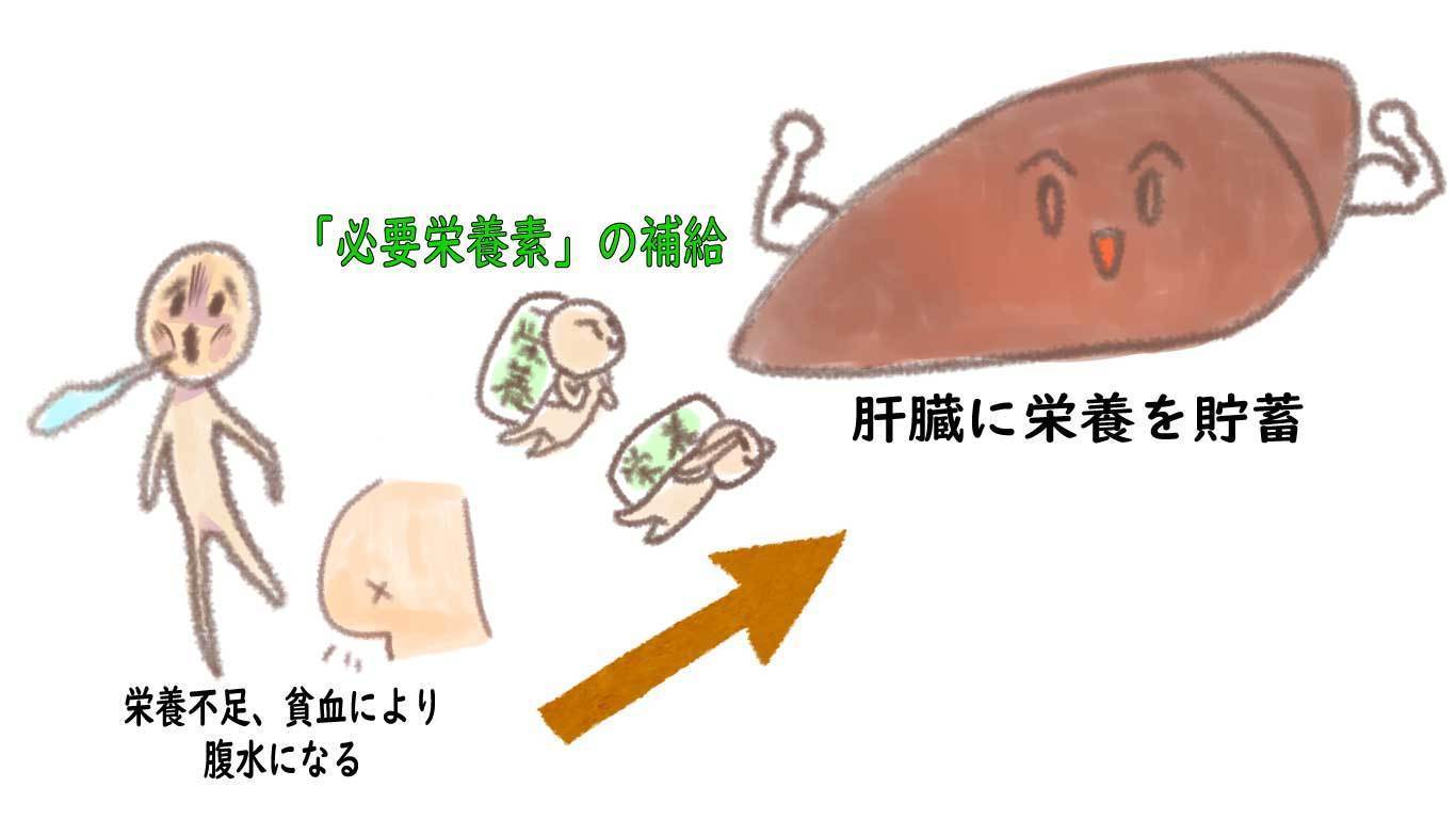 栄養状態の低下・貧血は腹水の原因になる→栄養状態を高め、栄養の貯蔵庫である肝臓にも、しっかり栄養を与える→「必要栄養素」の補給対策。